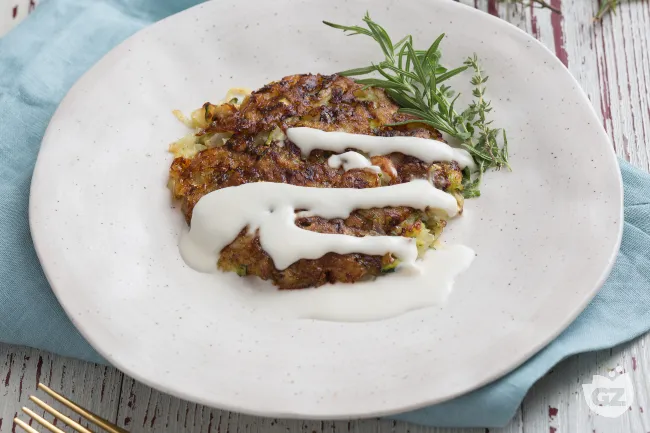 Il contrasto è l'anima del piatto: la crosta dorata e sfrigolante dei rosti, ottenuta dalla perfetta unione della patata starchiosa con l'acquosa delicatezza della zucchina, cede il passo a un cuore morbido e aromatico, esaltato dal Grana Padano Riserva e dal tocco fresco delle erbe. Su tutto, si stende come un velo di seta la fonduta, tiepida e avvolgente, il cui gusto ricco e leggermente salato lega ogni boccone in un abbraccio cremoso.