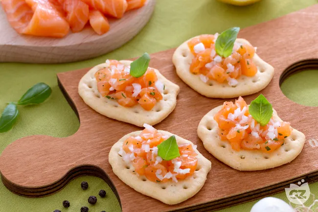 La tartare di salmone, marinata con delicatezza nel succo di limone, conserva la sua consistenza burrosa mentre il cipollotto fresco aggiunge una nota pungente ma mai invasiva. Il basilico spezza con la sua aromaticità erbacea, e l'olio extravergine d'oliva lega il tutto con un filo dorato e fruttato. Ogni cracker diventa così un palcoscenico dove la croccantezza secca incontra l'umidità succulenta della tartare, in un gioco di texture che invita al secondo morso.