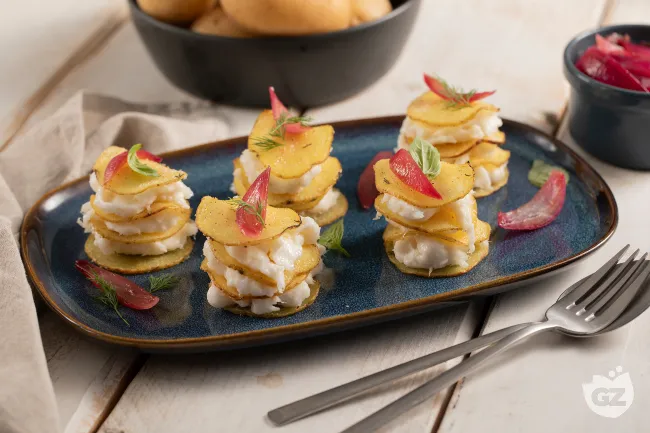 La Millefoglie di patate e baccalà è un inno alla sapiente dialettica tra terra e mare, dove la rusticità si veste di eleganza. Questo antipasto promette un'esperienza tattile e gustativa in cui ogni strato racconta una storia di contrasti risolti in armonia: il croccante che cede al morbido, il sapido che incontra il dolce, in una composizione che seduce il palato fin dal primo assaggio.
