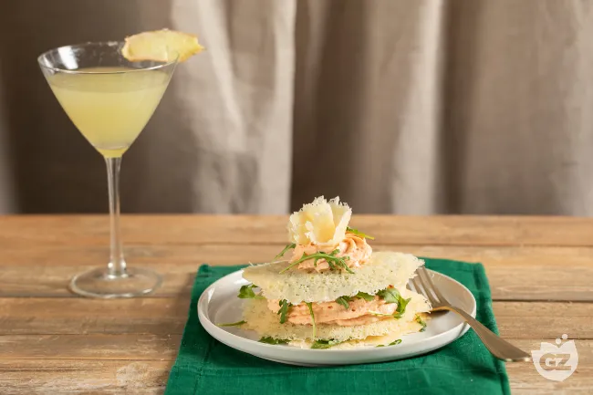 Un antipasto che seduce al primo morso, dove la sapienza della tradizione incontra un'estrosofia contemporanea. Le sfoglie di Grana Padano, trasformate in cialde dorate e fragili, racchiudono una promessa di contrasti: la potenza salina del formaggio stagionato si placa nell'abbraccio cremoso di una mousse, in un gioco di consistenze che è puro piacere tattile. La mousse rivela un'anima sorprendentemente fresca e vibrante, dove l'umami intenso dei pomodori secchi, dolce e concentrato, viene temperato dalla delicatezza lattea del formaggio fresco.