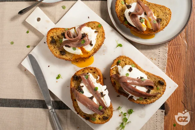 La magia nasce dal contrasto audace: la crosta scricchiolante del pane ai semi cede sotto la pressione del coltello, rivelando il cuore cremoso dell'uovo in camicia, un velo perfetto per il suo tuorlo fluido. È qui che irrompe l'alleanza decisiva: la sapidità minerale e marina delle acciughe del Cantabrico dialoga, senza sopraffarla, con l'ombra terrosa e vellutata della crema di tartufo nero. La maggiorana, con la sua nota fresca e leggermente agrumata, fa da ponte e alleggerisce l'insieme.