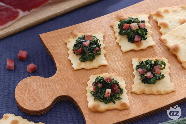 Il segreto risiede nel contrasto magistrale: la sapidità intensa e leggermente affumicata dello speck, tagliato in dadini che rilasciano il loro grasso prezioso, contro la terra, quasi minerale, del cavolo nero appassito, che cede la sua resistenza diventando vellutato. L'olio extravergine lega il tutto con una nota fruttata e pepata, elevando il piatto oltre la semplice stuzzicheria. Perfette per un aperitivo ricercato o come antipasto d'impatto, queste sfoglie uniscono la praticità della preparazione a un effetto finale di grande eleganza rustica, conquistando al primo morso.