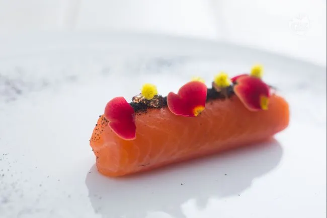 sensoriale dove la delicatezza naturale del pesce incontra la profondità dell'affumicatura e la brillantezza di un'acido fruttato, racchiuso in una forma scultorea che anticipa la cura artigianale. Un piatto che parla di tecnica e rispetto per la materia prima, elevando la trota a protagonista di una narrazione gastronomica complessa e appagante.