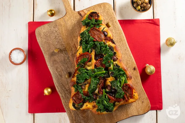 La focaccia si trasforma in un'opera d'arte commestibile, dove la tradizione pugliese incontra lo spirito festivo. Questa creazione unisce la rustica morbidezza di un impasto ben lievitato al carattere deciso delle cime di rapa, promettendo un'esperienza che seduce sia il palato che lo sguardo con la sua silhouette natalizia.