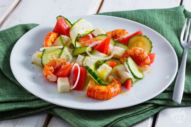 La dolcezza carnosa dell'anguria si fonde con la croccantezza acquerello delle zucchine a julienne, mentre i gamberi, appena scottati, rilasciano note marine che incontrano la cremosità sapida del Taleggio DOP. Il cipollotto rosso aggiunge una punta di piccante vibrante, e l'olio extravergine lega il tutto con un filo dorato e fruttato. Perfetto per un aperitivo al tramonto o come antipasto di una cena informale, questo piatto unisce la praticità della preparazione a un effetto visivo raffinato, dove i colori vivaci raccontano già la storia di sapori che verrà.