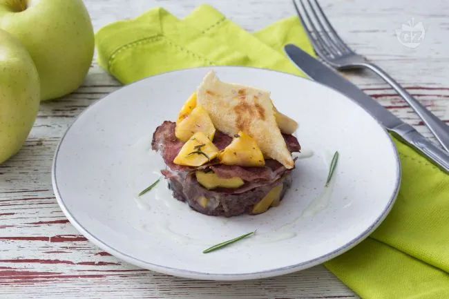 Il carattere della ricetta nasce dall'incontro tra Mele Golden Delicious, Pepe Nero, Latte Intero, Pane Guttiau: consistenze diverse, profumi netti e sapori che restano equilibrati al palato.