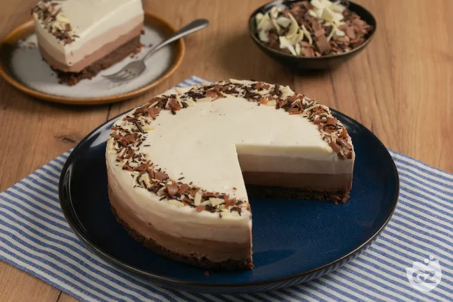 La magia risiede nel contrasto sensoriale: lo strato fondente offre una profondità quasi ambrata, quello al latte dona una rotondità avvolgente, mentre il bianco sfiora la nota burrosa e dolce. Ogni cucchiaio attraversa una base friabile di biscotti al cacao, che con la sua rusticità controllata bilancia la ricchezza della crema, regalando un gioco di consistenze tra croccante e morbidissimo. Perfetta per chiudere una cena importante o per trasformare un pomeriggio in un momento speciale, questa torta fredda unisce l'effetto scenografico di un dessert da pasticceria alla praticità di una preparazione senza cottura, risultando tanto imponente allo sguardo quanto appagante al palato.