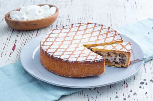Al taglio, la pasta frolla, profumata di limone e burro freddo, si sbriciola delicatamente per incontrare il cuore cremoso di ricotta di pecora: un incontro tra la rusticità terrosa del formaggio e la dolcezza raffinata dello zucchero a velo, punteggiato dalle note intense e spezzate del cioccolato fondente. Ogni boccone è un equilibrio tra consistenze, dove il granuloso sottile della ricotta dialoga con la morbidezza dell'impasto.