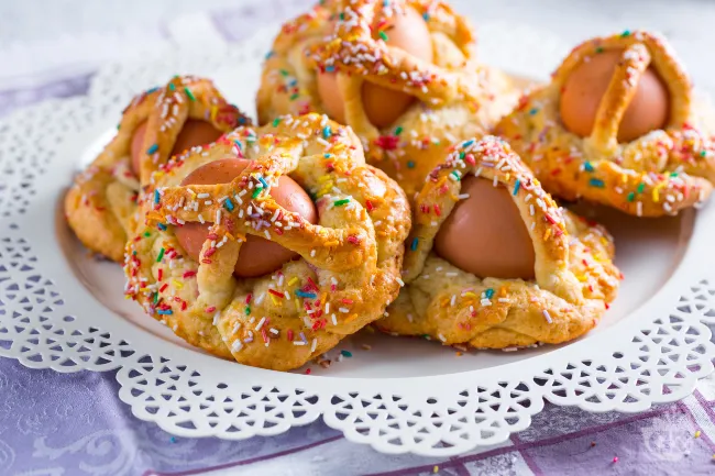 La sua forma circolare, intrecciata con maestria, evoca l'infinito ciclo delle stagioni e l'ospitalità generosa dell'isola. Le uova incastonate, simbolo di vita e prosperità, emergono dall'impasto come gemme preziose pronte a stupire occhi e palato.