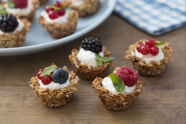 Immagina un incontro tra rusticità ancestrale e cremosità contemporanea: i cestini all'avena sono piccole sculture commestibili che racchiudono la promessa di una colazione che nutre corpo e sensi. La croccantezza dorata dell'avena tostata cede il passo a un cuore fresco e vibrante, in un gioco di contrasti che risveglia il palato fin dal primo morso.