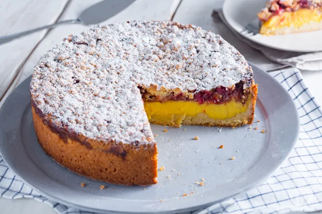 una pasta frolla che si sbriciola al tocco e la generosità di una crema pasticcera avvolgente. È un dolce dal carattere rustico ma raffinato, dove la cottura in forno esalta e amalgama i profumi, creando un'armonia di consistenze che seduce dal primo sguardo. La magia risiede nel contrasto tra la base granulosa e dorata, ricca di burro freddo che garantisce la perfetta 'sbriciolosità', e la doppia cremosità della vaniglia e della confettura.
