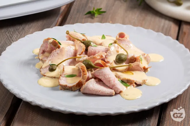La magia risiede nel contrasto magistrale: la fetta di vitello, cotta a bassa temperatura fino a raggiungere una succosità perfetta e un colore appena rosato, viene avvolta dall'abbraccio cremoso della salsa. Qui, il tonno si fonde con la maionese fatta in casa, l'aglio e l'aceto di mele, donando note sapide e leggermente acidule che esaltano senza sopraffare. L'olio extravergine e il rosmarino completano il quadro con il loro profumo erbaceo e mediterraneo.