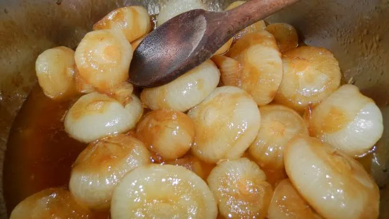 La magia nasce dall'incontro tra la delicatezza delle cipolline bianche, cotte fino a raggiungere una tenera consistenza che cede sotto i denti, e la salsa che le avvolge: lo zucchero semolato si fonde con l'aceto di mele creando un lucido specchio ambrato, mentre l'olio extravergine dona un fondo rotondo e fruttato. Il risultato è un gioco sensoriale dove la nota acidula sfuma in un retrogusto dolce, avvolto dal calore dell'olio.