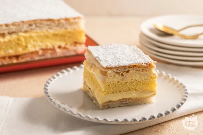 viaggio sensoriale tra consistenze opposte e complementari: la croccantezza dorata della sfoglia, la sofficità del pan di spagna, la setosità della crema. Un dessert che conquista palato e cuore con la sua eleganza senza tempo.