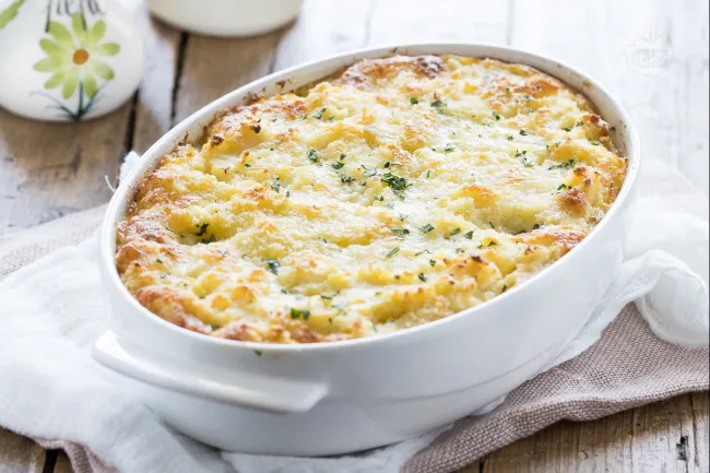 Il segreto risiede nel dialogo tra la dolcezza terrosa del cavolfiore, resa vellutata dalla patata, e la sapidità vibrante del Grana Padano, mentre la noce moscata vi intreccia un filo aromatico e caldo. Questo amalgama viene poi trafitto dal cuore di mozzarella, che al taglio si distende in fili dorati, creando un contrasto sublime tra la crosta croccante, imbrunita dal burro e dal pangrattato, e l'interno morbidamente cederevole. Perfetto come piatto unico d'autunno o come contorno speciale per una cena importante, questo sformato unisce la praticità di una preparazione anticipata all'effetto scenografico finale: una torta salata che, fumante, porta in tavola tutto il calore e il profumo di una cucina vissuta.