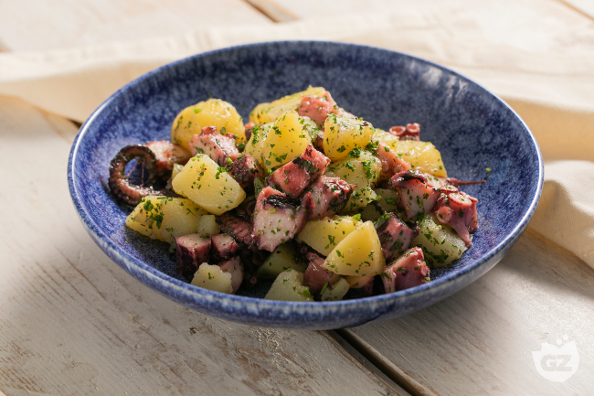 Un'armonia di sapori marini e terrosi che danza sul palato: il polpo, tenero e delicatamente dolce, si fonde con le patate cremose e consistenti. Il tutto è avvolto da un condimento vivace che esalta con note agrumate del limone, la rotondità dell'olio extravergine d'oliva e la freschezza erbacea del prezzemolo tritato finemente. Un piatto che offre contrasti piacevoli di temperatura tiepida e texture, perfetto per una cena elegante ma informale.
