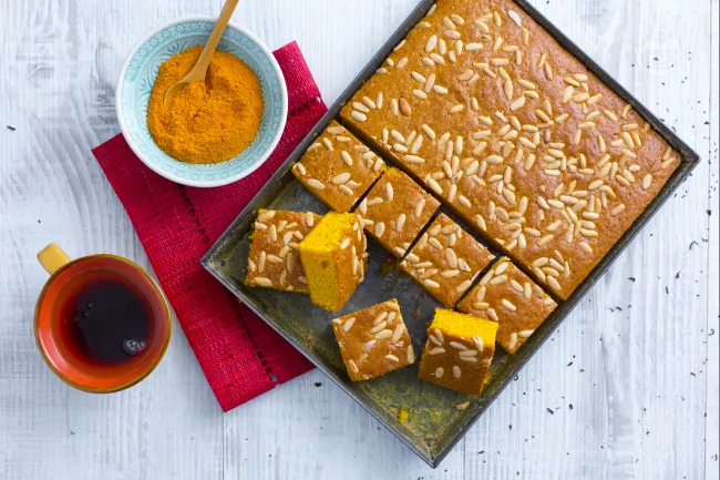 La magia nasce dall'incontro tra la farina e il semolino, che regalano una consistenza morbidamente granulosa, mentre la tahina e l'olio di semi assicurano un'umidità persistente e vellutata. I pinoli, tostati fino a diventare croccanti, offrono un contrasto dorato e aromatico che esalta la nota terrosa e leggermente pepata della curcuma.