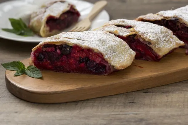 Lo strudel ai frutti di bosco è un abbraccio dolce che unisce la rustica eleganza della tradizione trentino-altoatesina alla generosa esuberanza della foresta. La promessa è quella di una crosta sottile e friabile che, al primo taglio, cede per rivelare un cuore vibrante di more, mirtilli e lamponi, un dessert che canta l'estate in ogni boccone.