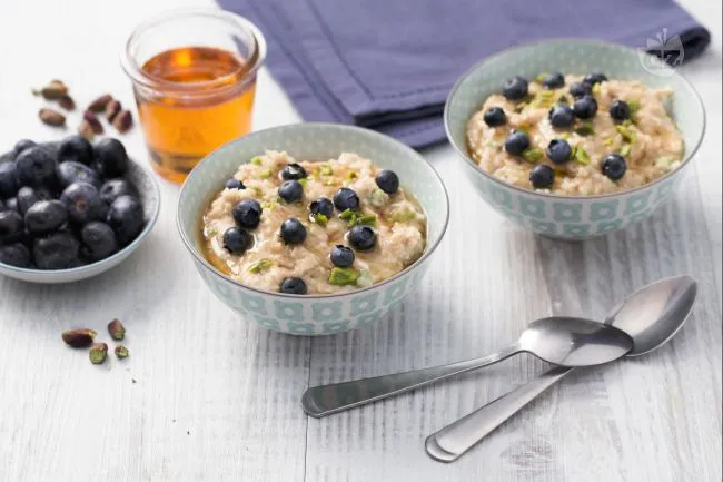 La magia si compone nel contrasto: i fiocchi d'avena, cotti con pazienza in un bagno di latte, si trasformano in una tela setosa che accoglie il tocco agrodolce dei mirtilli, piccole gemme che rilasciano un succo rubino al primo cucchiaio. Su tutto, il pistacchio sgretolato offre la sua nota terrosa e salina, un finale inaspettato che riequilibra la dolcezza dello sciroppo d'agave con eleganza.