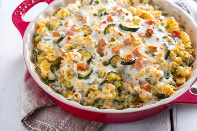 La magia risiede nei contrasti sapientemente orchestrati: la besciamella arricchita di ricotta, setosa e lieve, culla i fusilli e dialoga con la sapidità delicata del prosciutto cotto a cubetti. Il giardino di zucchine, carote e pisellini non è un semplice contorno, ma un coro di note dolci e terrose che si scioglie armoniosamente nell'insieme, mentre il parmigiano e la noce moscata diffondono un profumo caldo e invitante al momento del taglio.