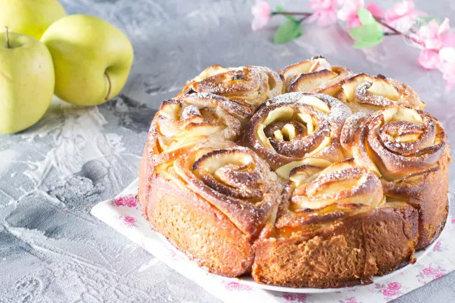 La magia risiede nel contrasto tra la pasta madre, che dona una consistenza incredibilmente ariosa e un retrogusto complesso, e la farcitura dove le mele, leggermente caramellate, si fondono con una crema di burro dal sapore ricco ma non invadente. Ogni boccone offre la croccantezza sottile degli strati esterni, cedendo poi a un cuore umido e profumato, dove l'acido fruttato bilancia la dolcezza rotonda dello zucchero a velo. Perfetta per concludere un pranzo domenicale in famiglia o per impreziosire una tavola da tè con amiche, questa torta non è solo uno spettacolo visivo di rose dorate, ma una garanzia di effetto: un dolce che sa essere insieme imponente e delicato, capace di trasformare un semplice momento in un ricordo da custodire.