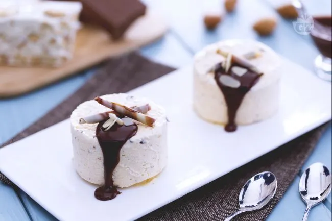 Un'emozione sospesa tra la cremosità del gelato e la consistenza del torrone, questo semifreddo incarna l'eleganza rustica della tradizione dolciaria italiana. Promette un viaggio sensoriale dove il fresco incontra il croccante, in un abbraccio di sapori nobili che seduce senza appesantire. La ganache al gianduia, lucida e vellutata, non è un semplice accompagnamento ma il sigillo di raffinatezza che completa l'esperienza.