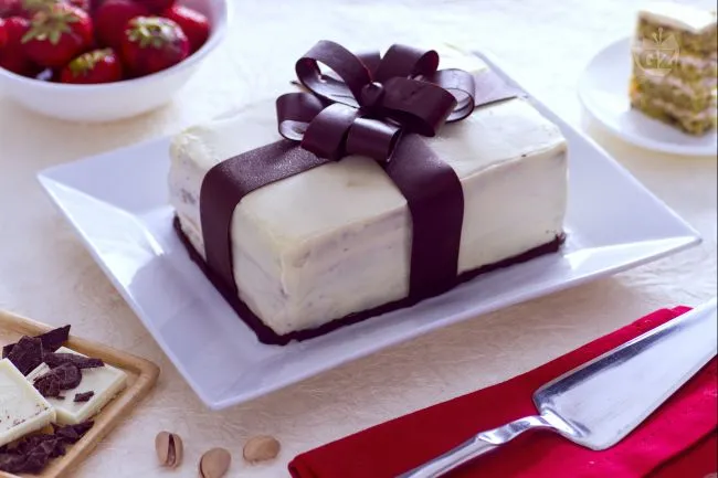 Il segreto risiede nella sinergia tra la morbidezza aromatica del pan di spagna al pistacchio – reso vibrante dalla pasta di pistacchio – e la crema alle fragole, che porta note agrodolci e una texture vellutata. La glassa al cioccolato bianco aggiunge una dolcezza elegante, mentre i nastri di cioccolato fondente introducono un piacevole morso croccante e un amaro raffinato, completando l'illusione di un pacco prezioso da scartare. Perfetta per celebrare occasioni speciali, questa torta unisce l'effetto scenografico a una realizzazione accessibile, regalando un momento di pura meraviglia che inizia dallo sguardo e si conclude in un ricordo gustativo indimenticabile.