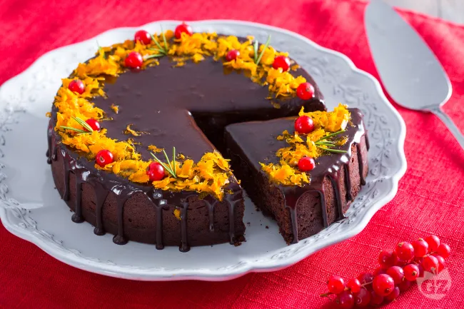 Il burro fuso garantisce una tessitura incredibilmente soffice e fondente, e il cacao amaro, scelto di qualità, dona profondità senza mai risultare stucchevole. Perfetta per concludere una cena delle feste o per trasformare un semplice tè pomeridiano in un momento speciale, questa torta si presenta con un'eleganza rustica: una glassa lucida al cioccolato che crea un contrasto di consistenze, adornata con la punta d'agro dell'arancia candita, il tocco resinoso del rosmarino e l'esplosione di colore e freschezza di qualche ribes.