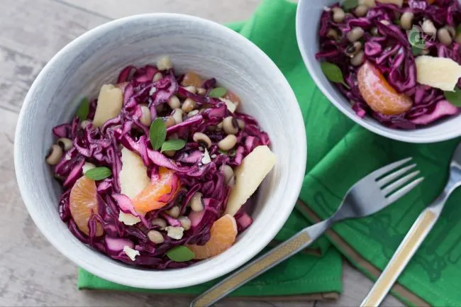 Il cuore del piatto batte nel contrasto tra la succosità acida dei mandarini e la potenza umami delle scaglie di Parmigiano Reggiano, mentre i fagioli dall'occhio, teneri ma persistenti, fanno da ponte a questa unione. Ogni boccone è una sinfonia tattile: lo schiocco fresco del cavolo cappuccio marinato, appena ammorbidito dal miele, dialoga con la granulosità del formaggio e lo scoppio zuccherino degli agrumi, il tutto legato dall'oro fruttato dell'olio.