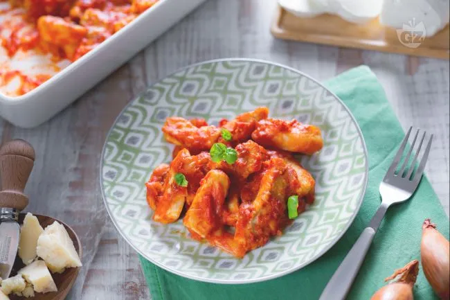 mediterranei, dove la semplicità degli ingredienti si trasforma in complessità armoniosa. La vera magia risiede nel contrasto tra la croccantezza dorata degli straccetti di pollo, leggermente infarinati, e l'abbraccio vellutato della salsa di pomodoro San Marzano, che cuoce lentamente fino a rilasciare la sua dolcezza naturale.