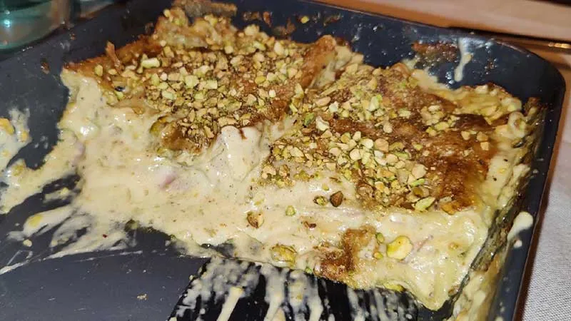 La besciamella al pistacchio, dalla consistenza vellutata e dal colore tenue, dialoga in modo magistrale con le fette saporite di mortadella, il cui gusto pieno e leggermente speziato viene temperato dalla provola che, fondendo, regala filanti note lattiche. Il contrasto tra il croccante finale dei pistacchi tritati e la morbidezza degli strati di pasta crea una piacevole oscillazione di texture in ogni boccone.