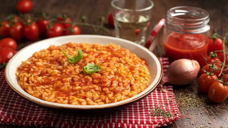 Il risotto al pomodoro è un abbraccio di sapori mediterranei che trasforma l'umile passata in un'esperienza culinaria elegante e confortante. La sua cremosità avvolgente promette non solo un primo piatto corroborante, ma un viaggio sensoriale dove l'acidità brillante del pomodoro dialoga con la ricchezza del riso. La magia sta nell'equilibrio: lo scalogno stufato nell'olio extravergine getta le basi aromatiche, mentre il vino bianco aggiunge una nota vivace che prepara il palato all'arrivo della passata.