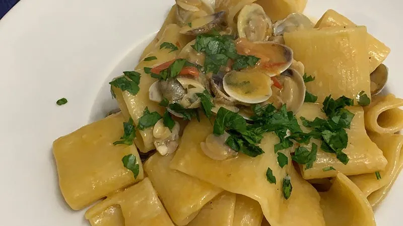 Il contrasto tra la dolcezza carnosa dei pomodorini scoppiati in padella e l'umami salmastro delle vongole appena aperte crea una sinfonia di sapori. L'aglio e il peperoncino non dominano, ma tessono un tappeto aromatico che esalta senza coprire, mentre l'olio extravergine lega il tutto con le sue note erbacee e piccanti. Ogni boccone regala la soddisfazione del pacchero che trattiene il sughetto, esplodendo di sapori concentrati.