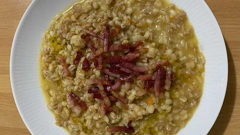 La magia sta nei contrasti: la morbidezza cremosa dell'orzo e del farro precotti, che assorbono il fondo aromatico del soffritto, dialoga con il guizzo croccante e affumicato della pancetta a listarelle. Ogni cucchiaiata rivela la dolcezza delle carote, la profondità della cipolla dorata e il tocco erbaceo del sedano, fondendosi in un brodo ricco e avvolgente.