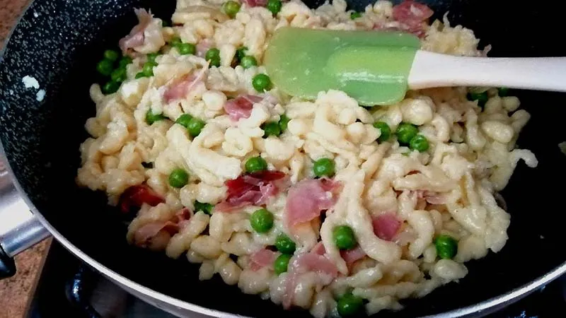 Un abbraccio rustico tra le Alpi e la pianura padana, dove la morbidezza avvolgente degli spätzle incontra il carattere deciso dello speck. Questo piatto promette un viaggio sensoriale in cui la semplicità degli ingredienti si trasforma in un'esperienza di comfort food raffinato, capace di riscaldare il palato con la sua generosità. La magia sta nel contrasto: i piselli, dolci e vibranti, smorzano l'intensità salata dello speck, mentre la cipolla caramellata dona una nota di fondente dolcezza che lega ogni boccone.