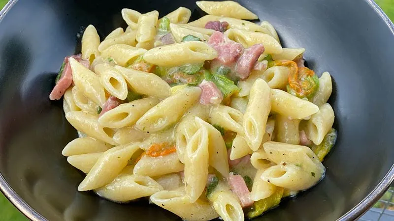 rustica che danza tra sapori decisi e delicatezze primaverili: le mezze penne con speck, zucchine e fiori di zucca promettono un primo piatto dove la sapidità carnosa incontra la freschezza vegetale in un abbraccio immediato e appagante.