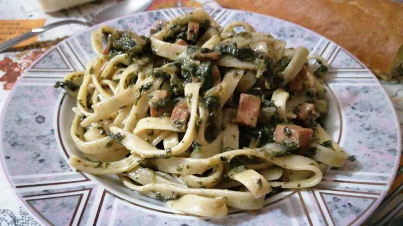 Le tagliatelle con bietole e prosciutto sono un'ode alla primavera in tavola, dove l'eleganza rustica incontra una sapienza contadina raffinata. Questo piatto promette un equilibrio perfetto tra la dolcezza terrosa delle verdure e la carezza sapida della carne, avvolgendo il palato in un abbraccio confortevole ma mai pesante.