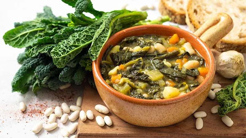 Il cavolo nero, cotto fino a diventare tenero ma non sfatto, regala una nota minerale che dialoga con la cremosità vellutata dei fagioli cannellini. Il soffritto di sedano, carota e cipolla, fondendosi con il brodo vegetale, costruisce una base aromatica dolce e complessa, mentre un tocco di peperoncino (se aggiunto) accende il tutto con un lieve, piacevole calore. Perfetta per una serata d'autunno o come piatto unico corroborante, questa zuppa guadagna sapore il giorno dopo, diventando ancora più intima e avvolgente. Il filo d'olio extravergine a crudo, aggiunto al momento di servire, ne esalta la fragranza e completa l'esperienza con un finale fresco e fruttato.