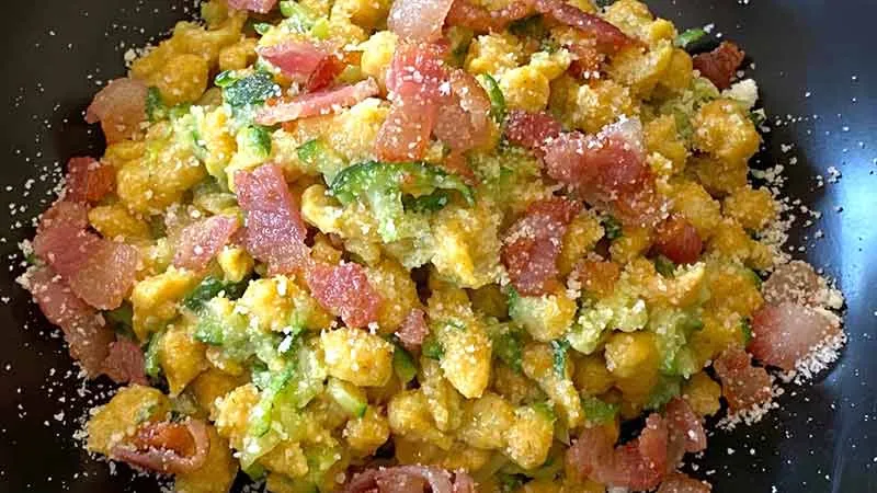 Un abbraccio rustico che parla di radici e sapori decisi: gli spätzle di farro, con la loro consistenza ruvida e accogliente, diventano il palcoscenico perfetto per un incontro tra la dolcezza cremosa delle zucchine e l'irresistibile potenza del guanciale croccante. È un primo piatto che promette e mantiene, portando in tavola tutto il carattere della cucina di sostanza. La magia sta nel contrasto: i petali di guanciale, rosolati fino a diventare una croccante esplosione di sapidità, si fondono con la delicatezza burrosa delle zucchine a tocchetti, mentre una grattugiata di noce moscata fresca lega gli aromi con una nota calda e avvolgente.