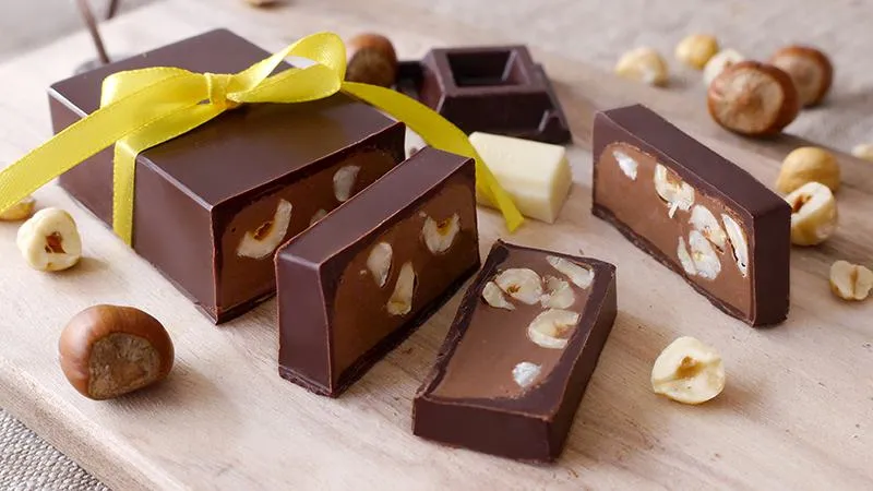 La magia nasce dall'incontro tra la profondità terrosa del fondente e la cremosità vellutata del bianco, un dialogo perfetto che la crema di nocciole lega con note tostate e burrose. Le nocciole, croccanti e fragranti, offrono una piacevole resistenza che frammenta la massa morbida, regalando un gioco di contrasti tra la consistenza fondente e lo scricchiolio aromatico.