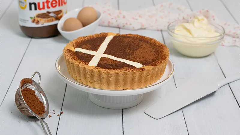 con la panna, mentre uno strato di Nutella scivola tra i due, aggiungendo note profonde di nocciola e cacao. È l'incontro perfetto tra l'eleganza rustica della crostata e il comfort familiare del tiramisù, un dessert che promette e mantiene un'esperienza sensoriale stratificata e memorabile.