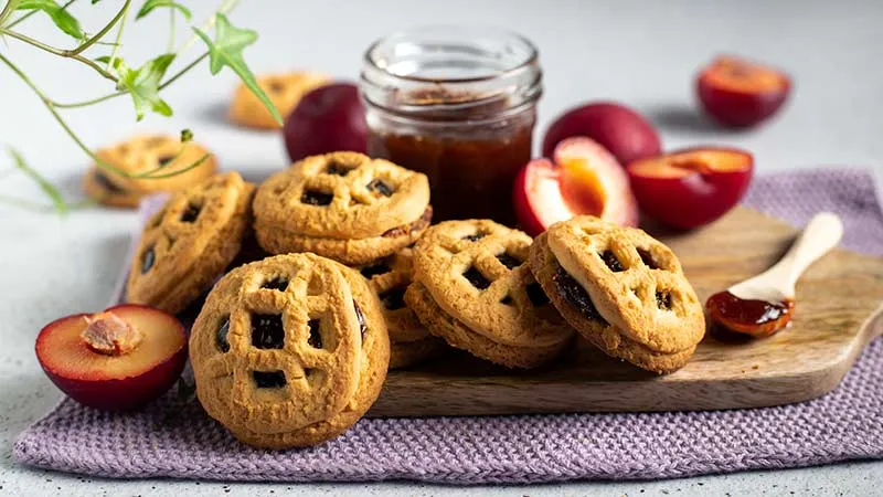 Un incontro di rustica eleganza tra la genuinità della farina integrale e la dolcezza malinconica della prugna. Questi biscotti promettono una colazione che nutre il corpo con la sua struttura ricca di fibre e l'anima con il suo cuore fruttato, trasformando un semplice momento in un rito di piacere consapevole. La crosta leggermente granulosa, grazie allo zucchero di canna, cede il passo a un interno morbido e delicatamente vanigliato, per poi incontrarsi con il cuore vibrante della marmellata, che porta con sé note agrodolci e un retrogusto caldo.