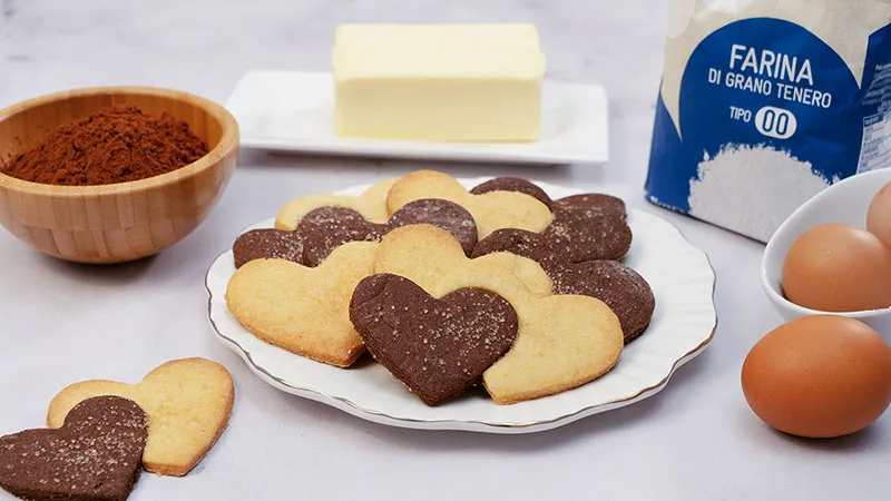 I biscotti cuore bicolore sono un'eleganza domestica che gioca tra la purezza della vaniglia e la profondità terrosa del cacao. Non sono semplici dolcetti, ma piccole sculture da tè, dove la precisione della forma incontra l'audacia del contrasto, promettendo un'esperienza che alterna note delicate a un retrogusto intenso e avvolgente. La magia risiede nell'unione dei due impasti: da un lato, la morbidezza burrosa e aromatica dell'impasto chiaro, esaltato dai semi di vaniglia; dall'altro, la versione al cacao amaro, più strutturata e lievemente austera.
