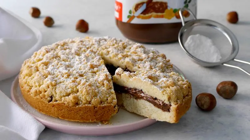 La magia risiede nel dialogo tra la pasta sbriciolata, ricca di burro freddo che garantisce una texture irregolare e irresistibilmente granulosa, e la generosa colata di crema alla nocciola, che a caldo si fonde in un nucleo tiepido e avvolgente. Lo zucchero semolato crea una delicata crosticina cristallina, mentre la vanillina e le uova donano un profumo antico e una morbidezza che cede sotto i denti.