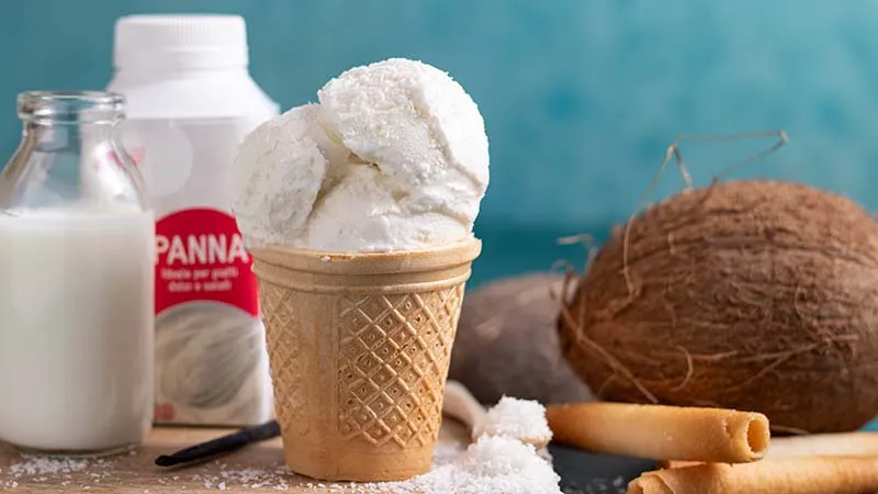 La magia nasce dall'incontro tra la bacca di vaniglia, che dona note profonde e calde, e il cocco grattugiato che, oltre a decorare, regala inaspettati scricchiolii in contrasto con la fondente morbidezza. La panna fresca e il latte creano una base incredibilmente liscia, mentre lo zucchero semolato si scioglie in una dolcezza mai stucchevole, ma luminosa.