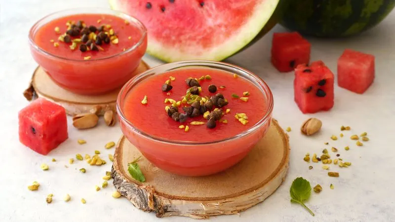 La magia risiede nel contrasto tra la dolcezza acquosa dell'anguria, esaltata dallo zucchero e addensata dall'amido, e il calore aromatico della cannella in stecca. Questa base delicata diventa poi palcoscenico per il gioco finale: lo scrocchiare delle gocce di cioccolato fondente che si sciolgono in bocca e la croccantezza salata della granella di pistacchi, che aggiunge un tocco di eleganza rustica e una piacevole nota sapida.