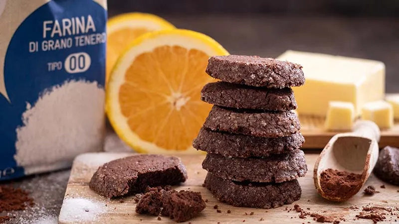 Il segreto risiede nel dialogo audace tra l'intensitĂ quasi selvaggia del cacao e la nota solare e vibrante della scorza d'arancia grattugiata. Il burro, morbido e avvolgente, fa da ponte a questi contrasti, mentre l'amido di mais garantisce quella consistenza sabbiosa e delicata che si scioglie letteralmente in bocca, lasciando una scia di agrumi e cioccolato.