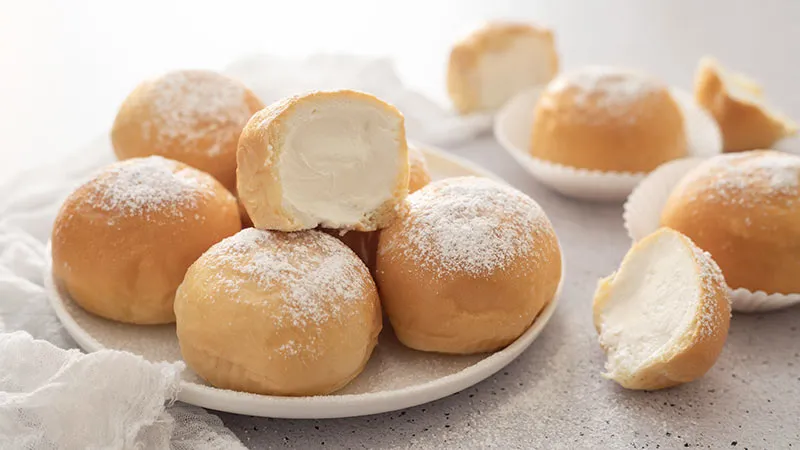 un'anima di crema vellutata: una promessa di dolcezza semplice e raffinata, capace di trasformare un momento qualsiasi in una piccola celebrazione. La loro magia risiede nel contrasto tra l'involucro arioso, leggermente caramellato in superficie, e il cuore fresco e cremoso che si sprigiona al primo morso.