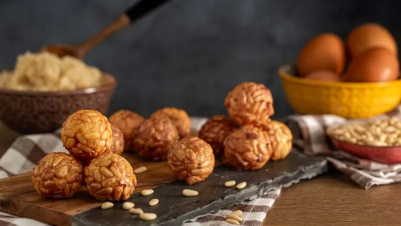 Perfetti per concludere un pranzo d'autunno o per accompagnare un vino dolce, i panellets si trasformano in piccole opere d'arte artigianali: ogni morso racconta una festa, ogni boccone conserva il calore di una cucina che sa accogliere.