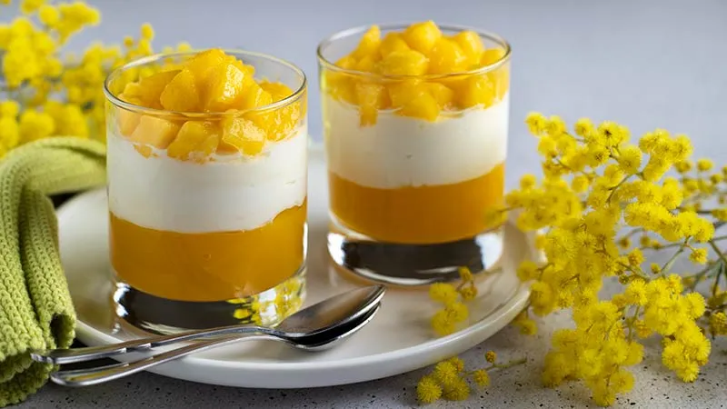 La gelée, vibrante come un tramonto esotico, incapsula l'essenza pura del frutto, mentre la mousse al mascarpone e yogurt greco stempera ogni nota con una cremosità setosa, arricchita dal tocco croccante del cocco grattugiato. I cubetti di mango marinati, lucidi di sciroppo, offrono il contrappunto finale: un morso succoso che risveglia i sensi. Perfetto per chiudere una cena estiva o per portare in tavola un tocco di luce, questo dessert unisce l'impatto scenografico degli strati a una preparazione sorprendentemente accessibile, lasciando in bocca un ricordo fresco e persistente.